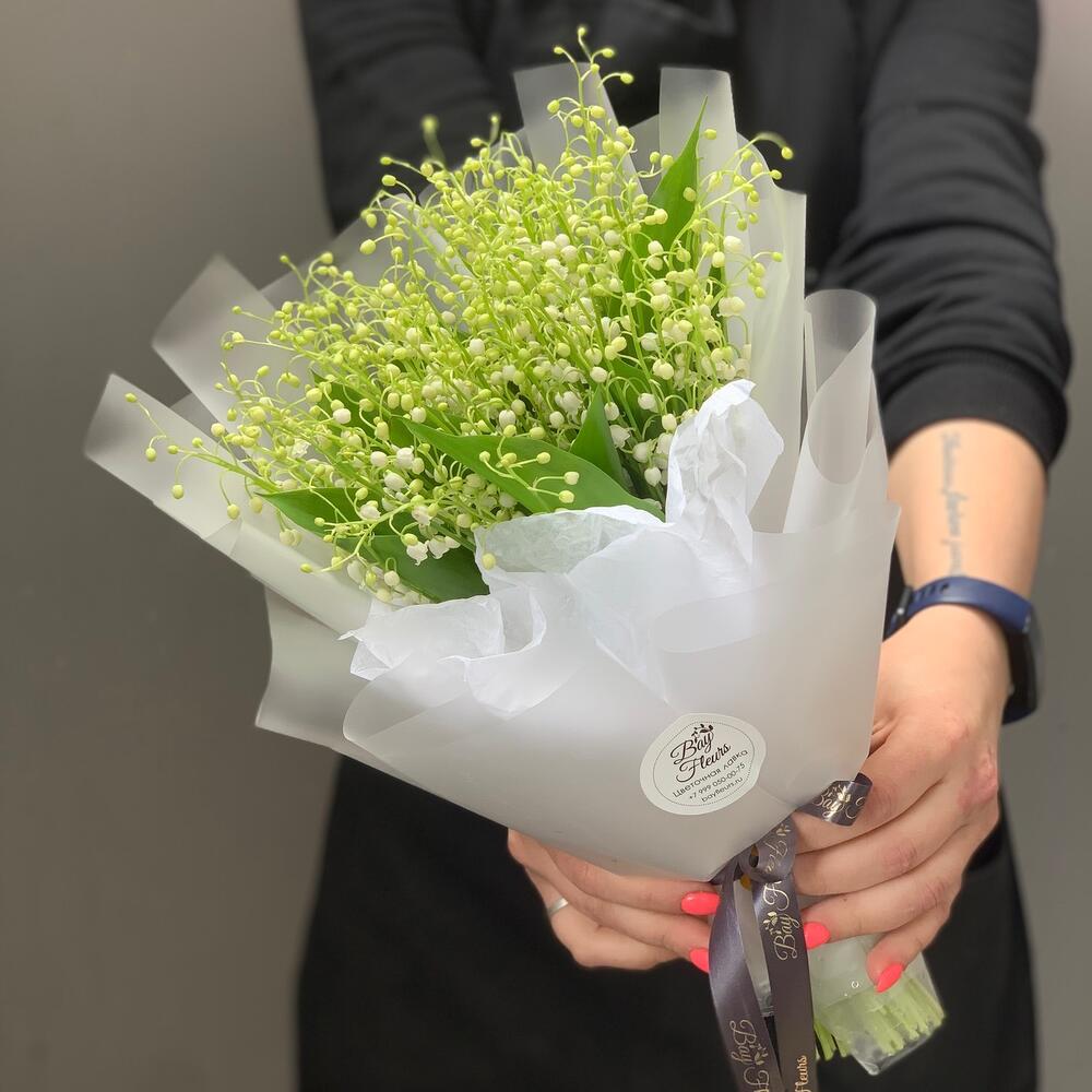 ландыши пучок – 1 шт.Упаковка дизайнерская – 1 шт.Лента атласная – 1 шт.