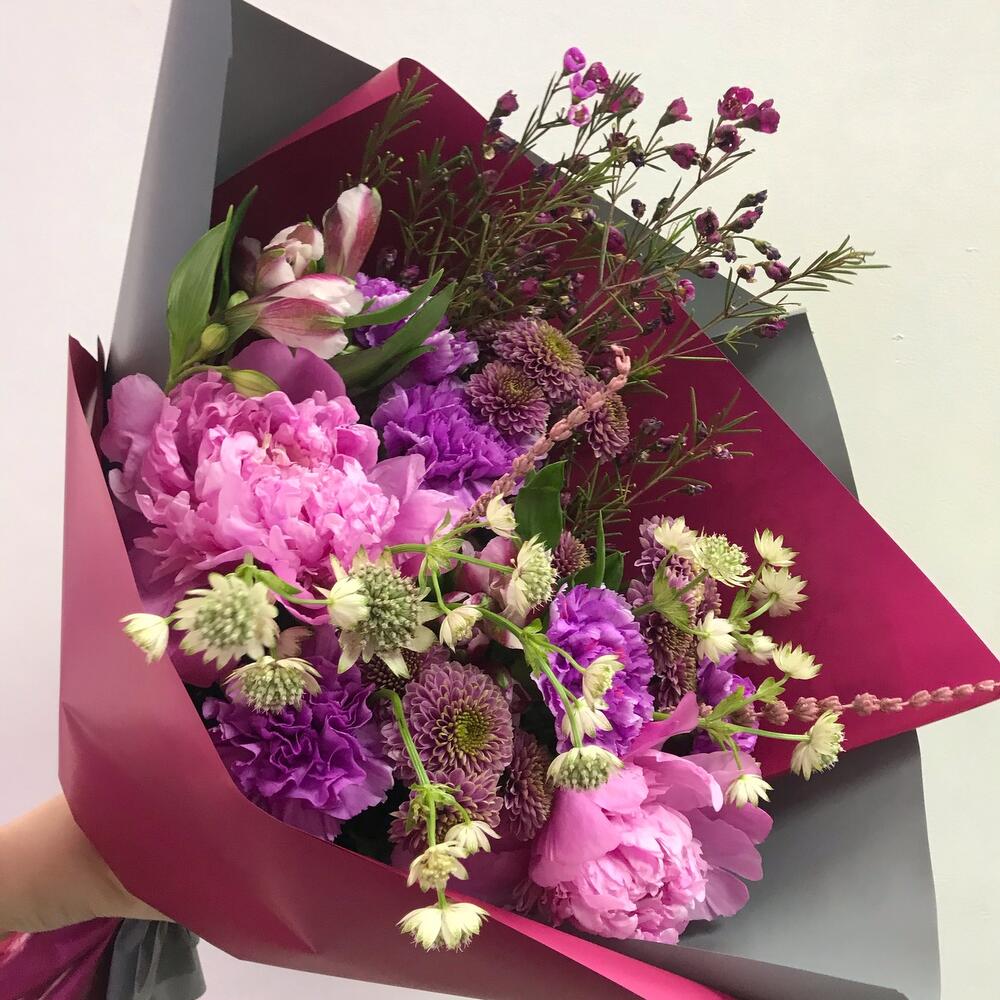 Альстромерия – 2 шт.Лаванда – 2 шт.Пион – 2 шт.Хризантема Сантини – 3 шт.Гвоздика – 5 шт.Хамелациум – 1 шт.Астранция – 2 шт.Открыточка с вашими пожеланиями – 1 шт.Авторская упаковка – 1 шт.