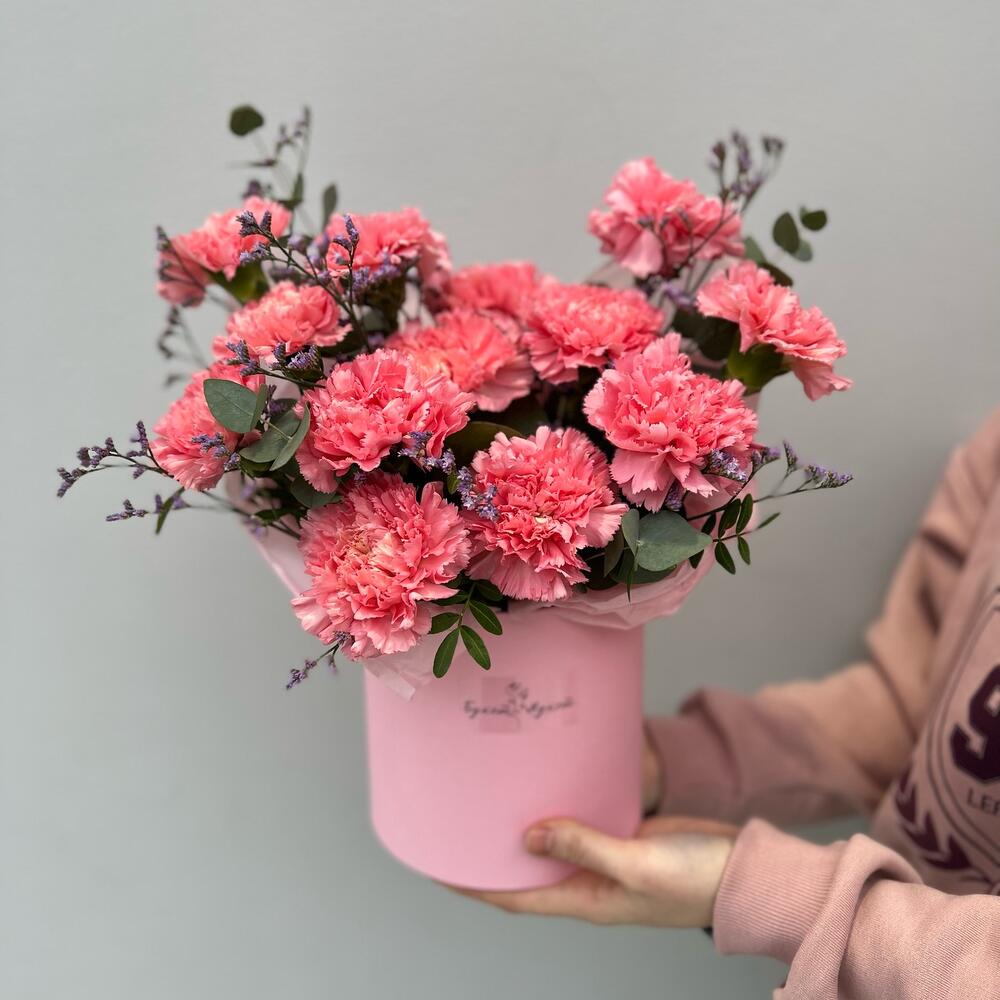 Лимониум – 1 шт.Эвкалипт – 1 шт.Диантус – 13 шт.Коробка шляпная – 1 шт.Оазис флористический – 1 шт.листья фисташки пучок – 1 шт.