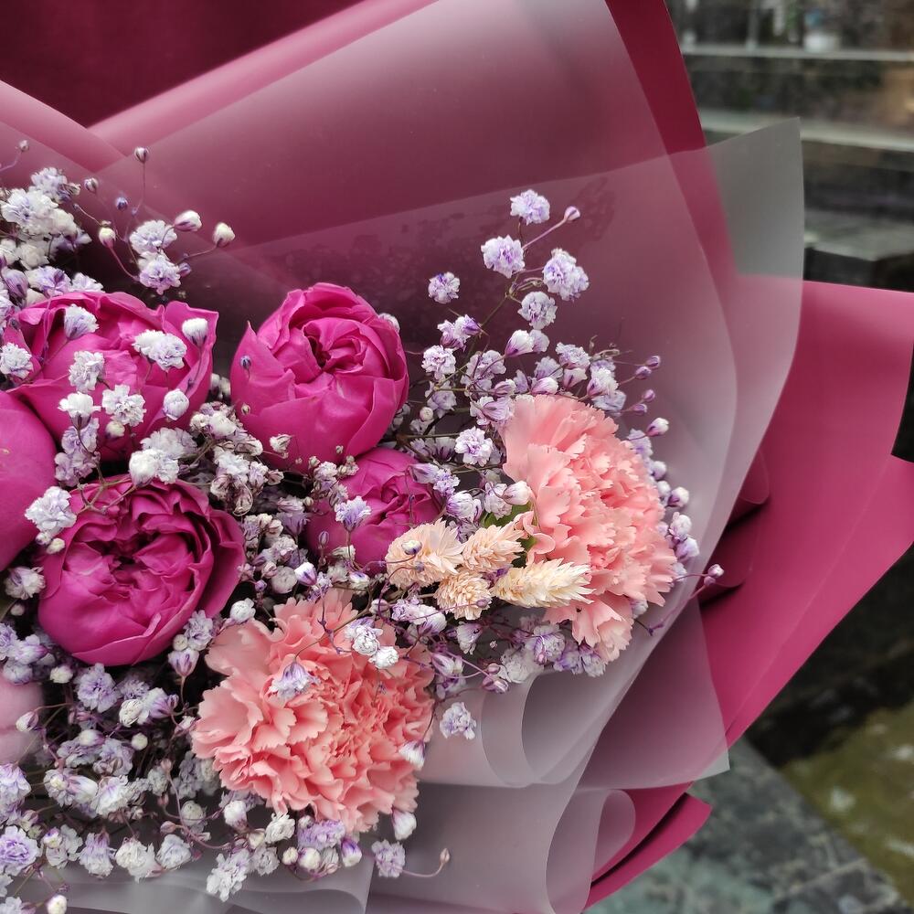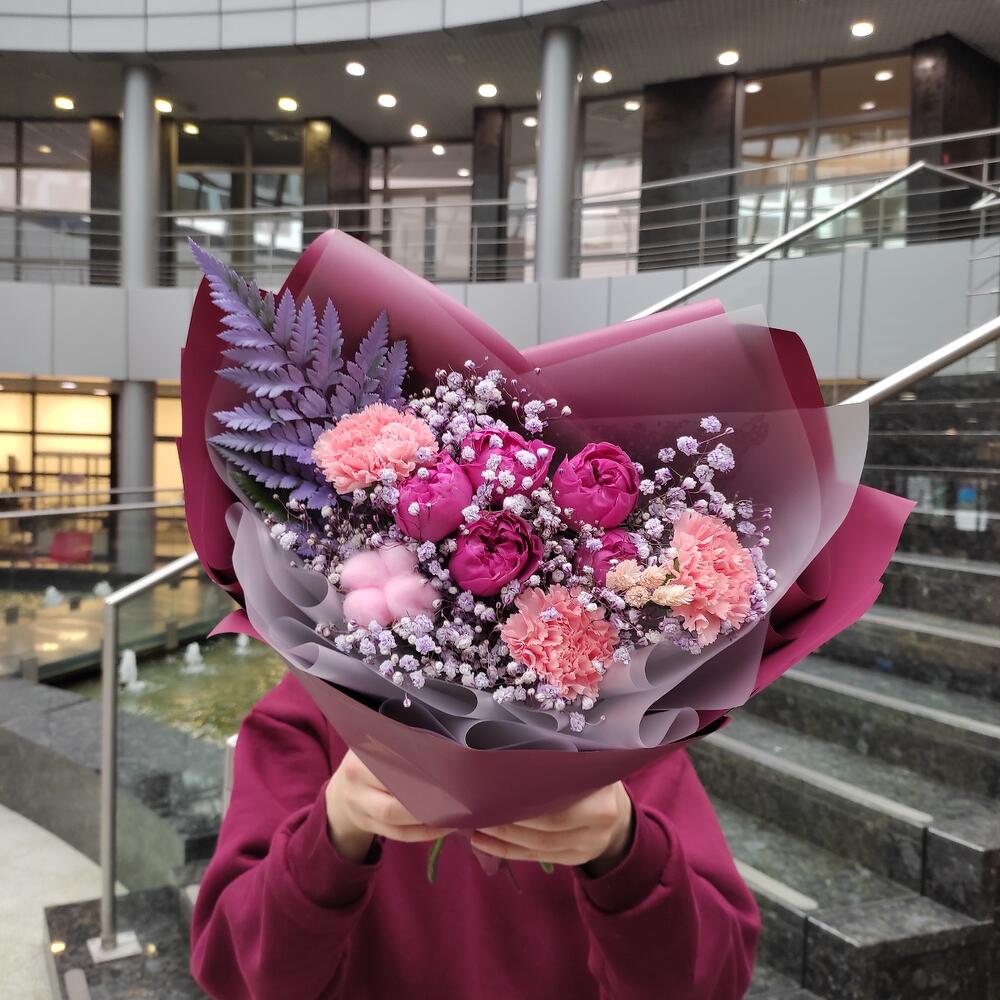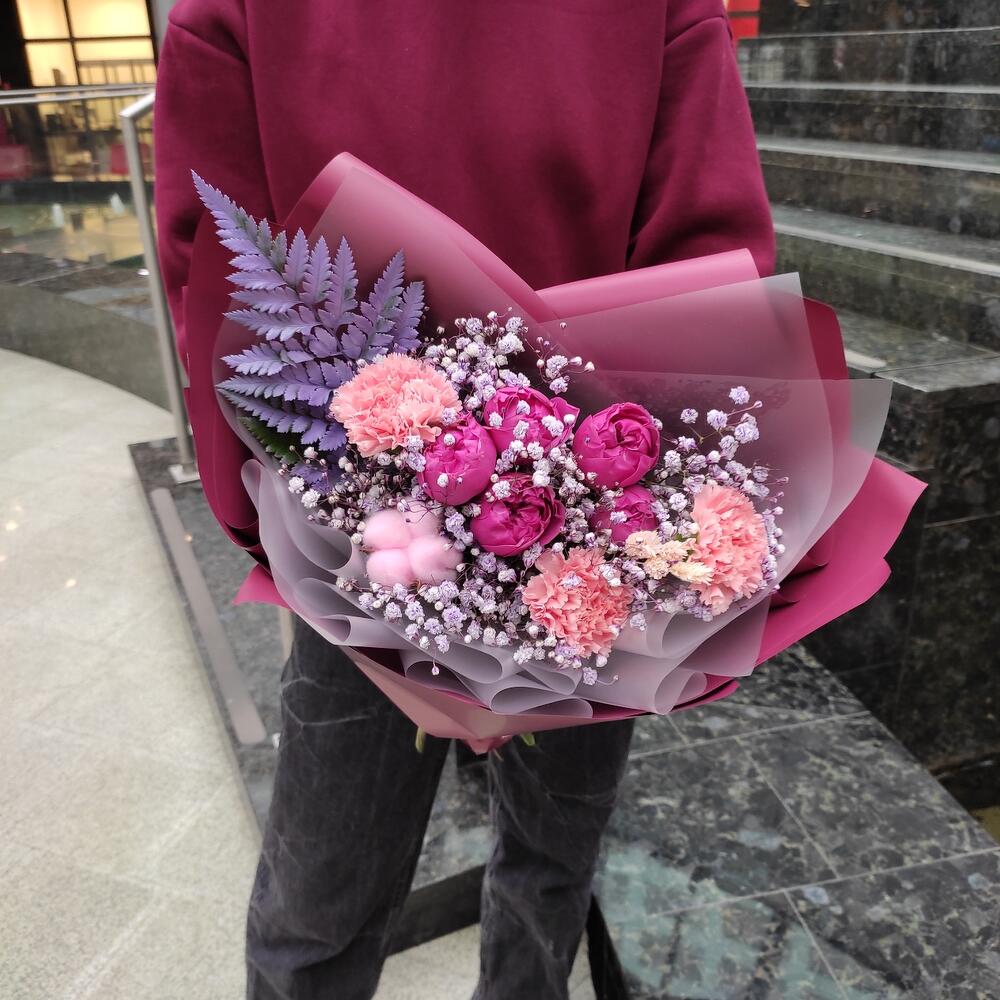 Гвоздика сортовая – 3 шт.Misty bubbles – 1 шт.Гипсофила – 1 шт.Хлопок натуральный – 1 шт.папоротник ветка – 1 шт.