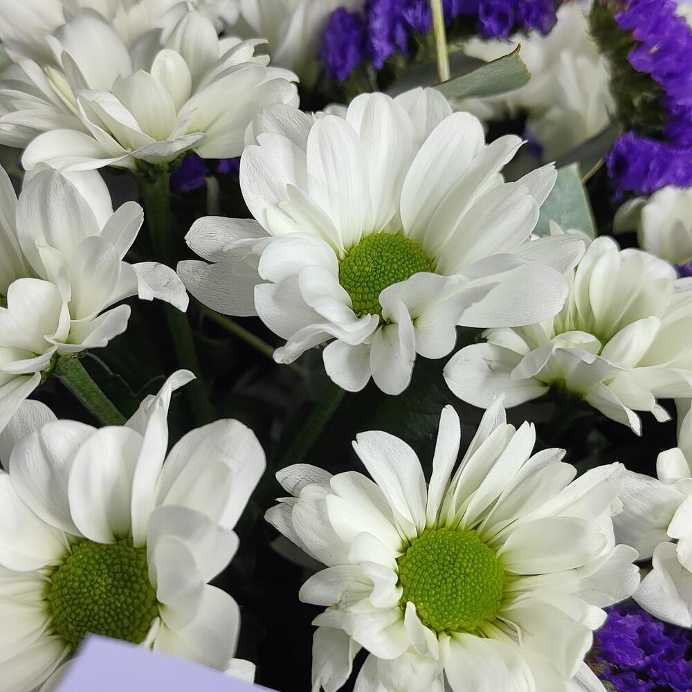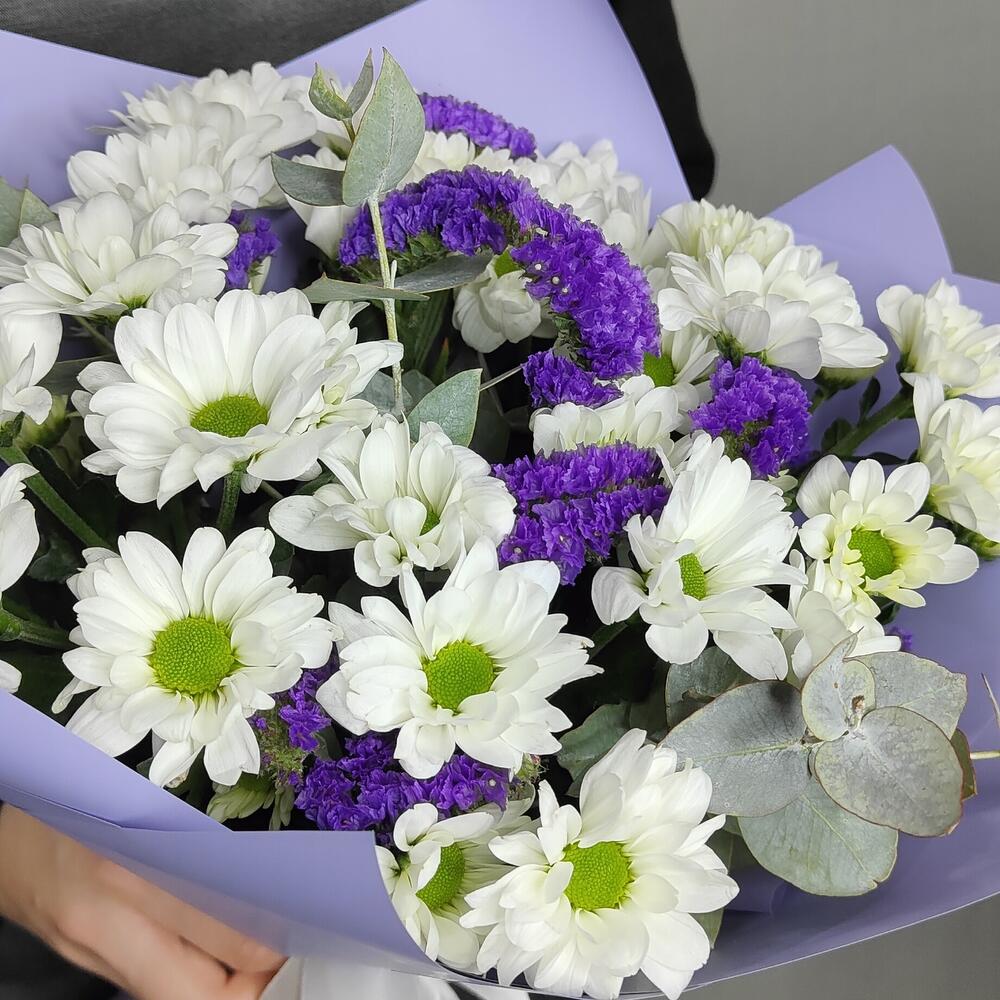 Букет из ромашковой хризантемы, статицы и эвкалипта “Счастье”