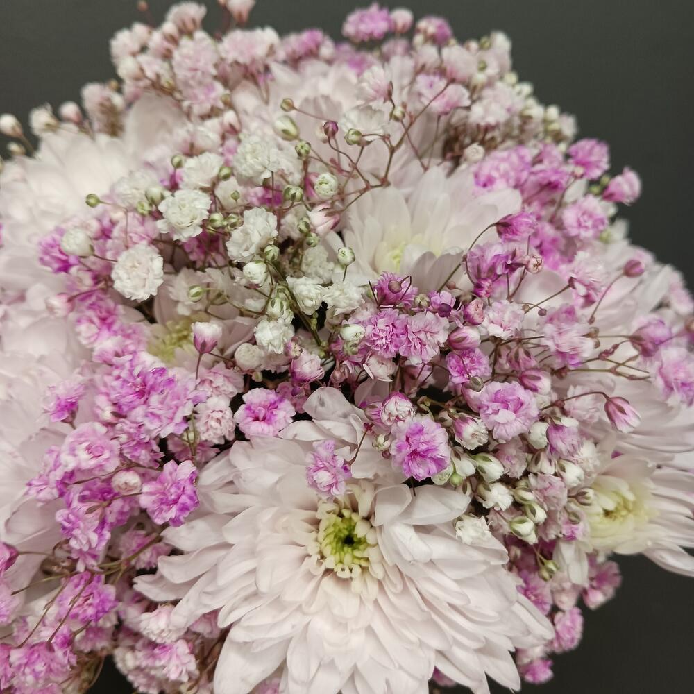 Гипсофила – 3 шт.Хризантема кустовая – 2 шт.Стакан декоративный – 1 шт.Оазис флористический – 1 шт.