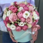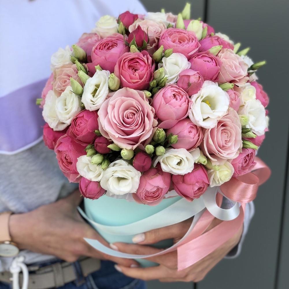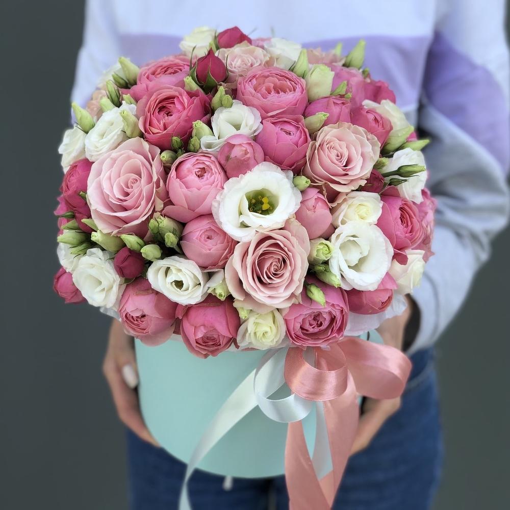 Композиция из пионовидной кустовой розы, эустомы и одноголовой розовой розы