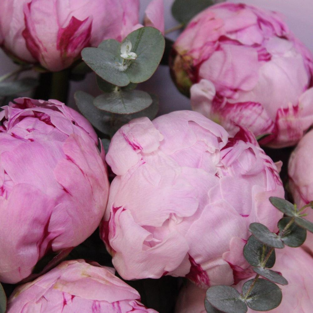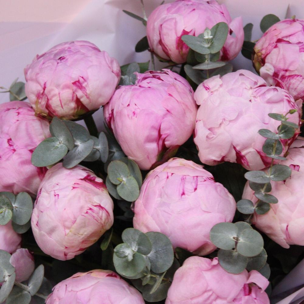 Лента атласная – 3 шт.Пион Сара Бернар – 15 шт.Эвкалипт Baby Blue – 5 шт.