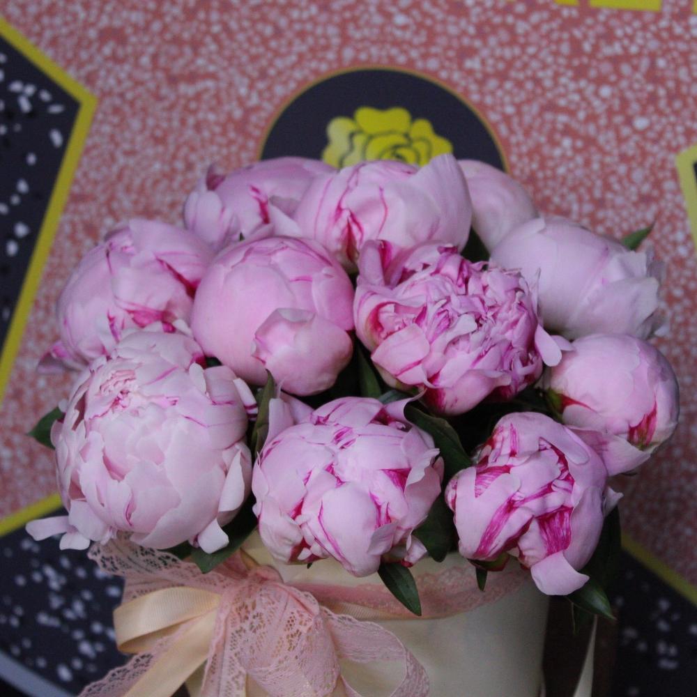 Лента атласная – 4 шт.Шляпная коробка – 1 шт.Пион Сара Бернар – 11 шт.Оазис флористический – 1 шт.