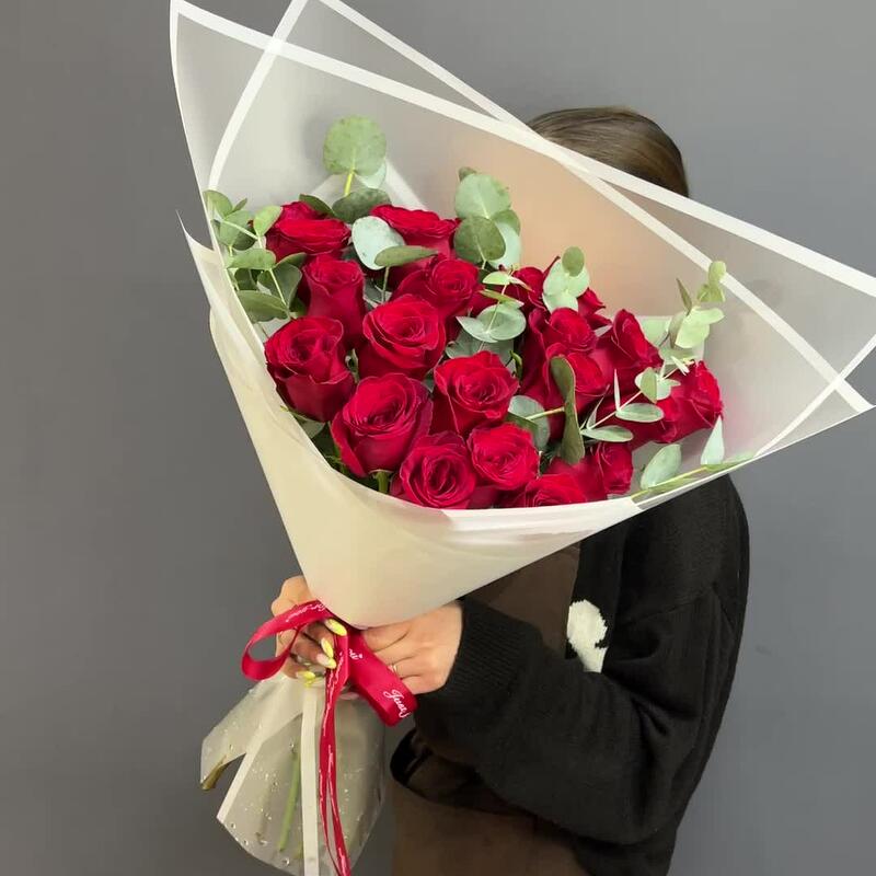 Эвкалипт – 7 шт.Атласная лента – 1 шт.Роза Эквадор 60 см – 21 шт.Дизайнерская упаковка – 1 шт.