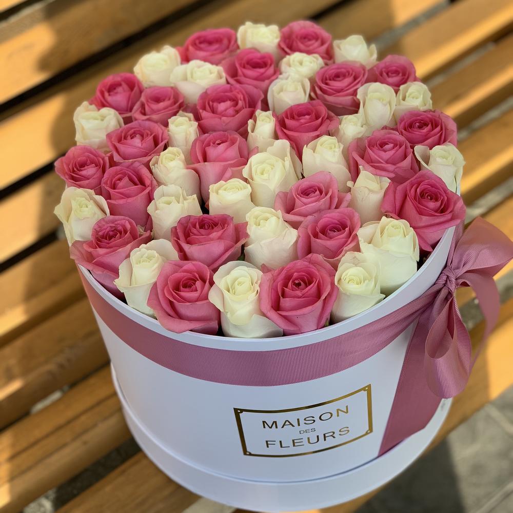 45 роз розовых и белых в коробке