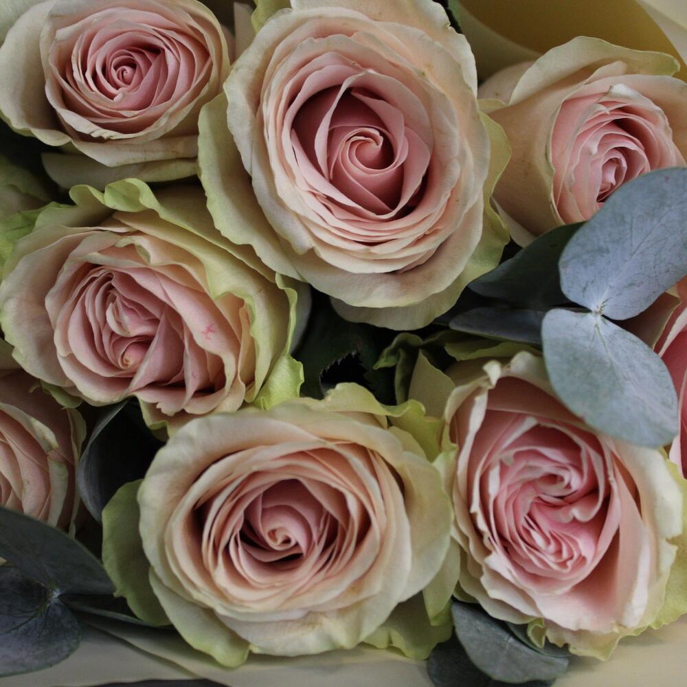 роза фруттето эквадор – 9 шт.Эвкалипт – 3 шт.Пленка матовая – 4 шт.Лента атласная – 2 шт.