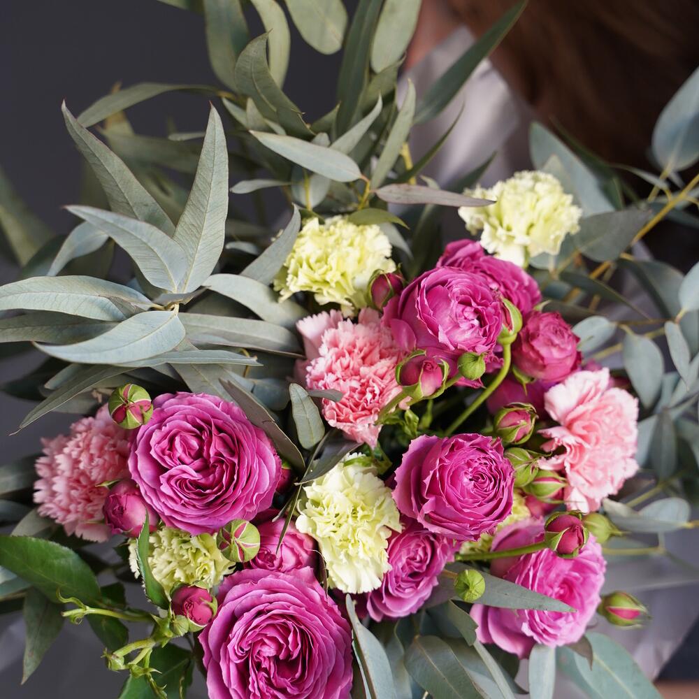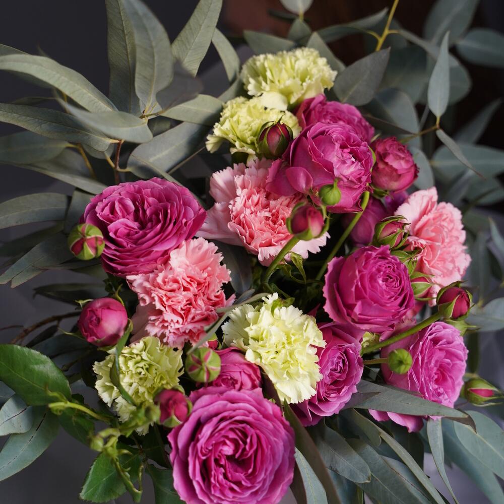 Гвоздики, Кустовые розы, Лизиантусы, Пионовидные розы, Розы