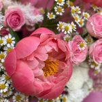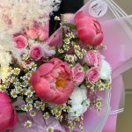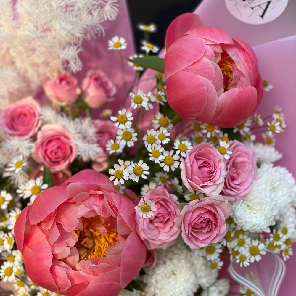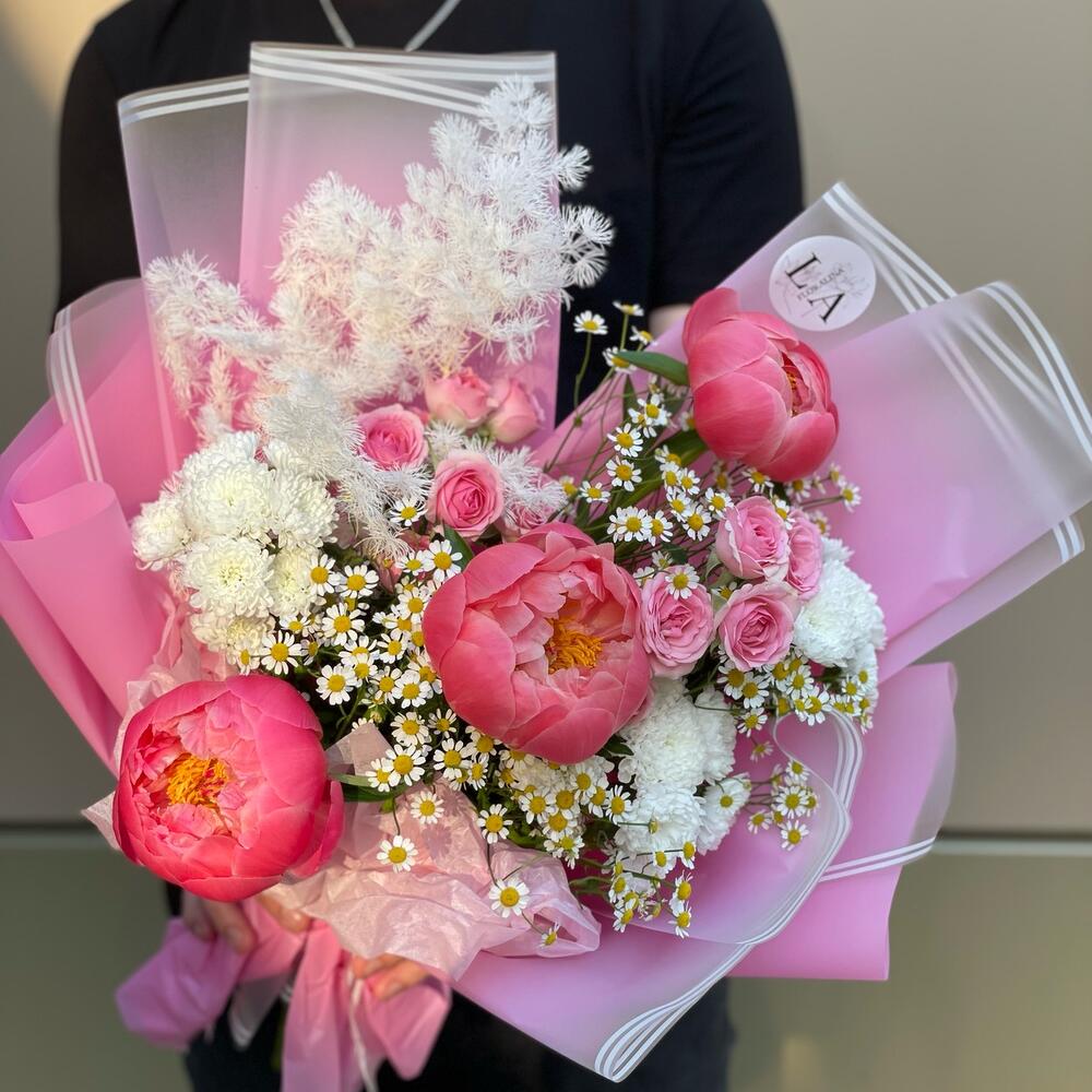 Авторский букет с пионами,кустовыми ромашками и розами
