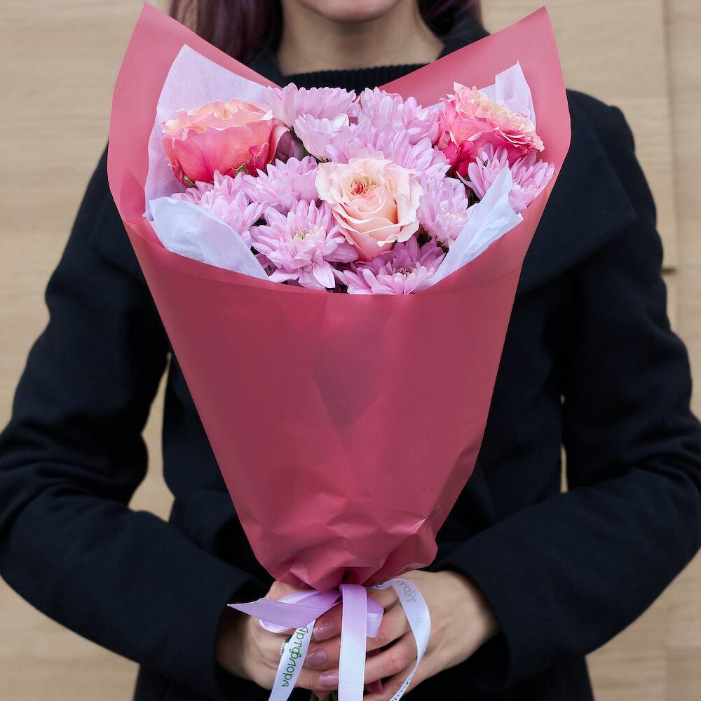 Роза Эквадор – 3 шт.Хризантема кустовая – 4 шт.Дизайнерская упаковка – 1 шт.