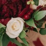 пионы бордовые – 9 шт.Роза одноголовая – 7 шт.Хиперикум красный – 5 шт.зелень декоративная – 15 шт.Лента атласная – 2 шт.