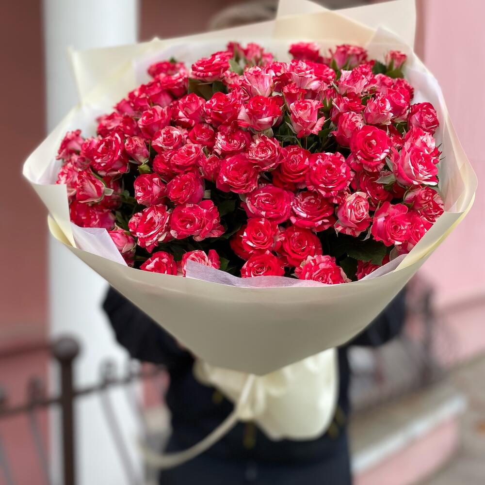 Букет из 19 веток кустовых роз сорта фаер воркса. Количество роз (бутонов) может достигать 131 штуки.