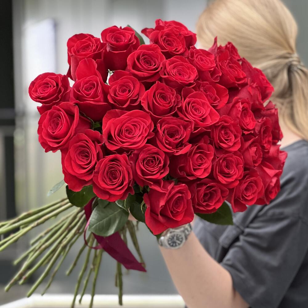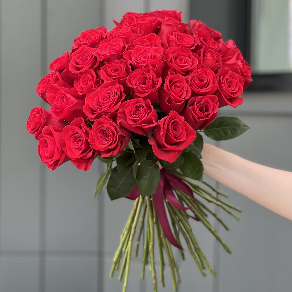 35 красных роз оформленных лентой!