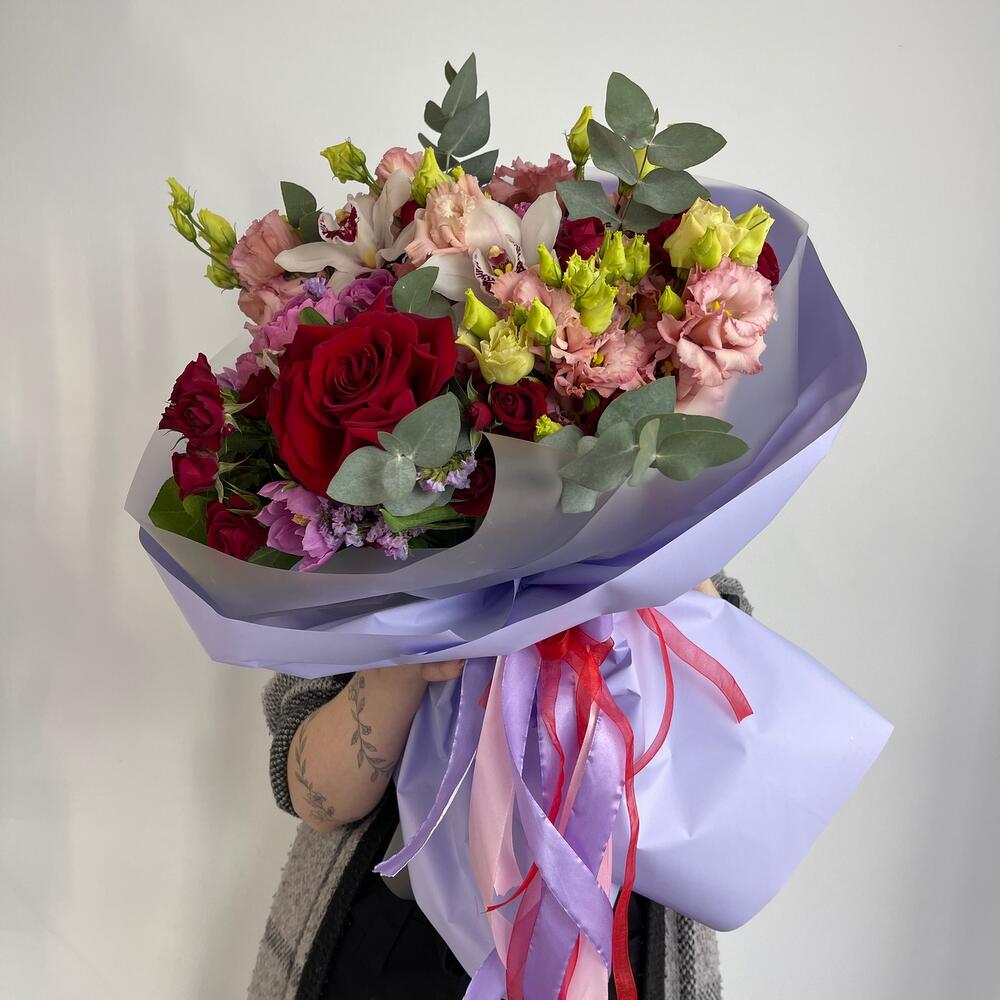 Кустовая роза – 4 шт.Бомбастик – 3 шт.Эустома – 4 шт.Тюльпан – 3 шт.Альстромерия – 2 шт.орхидея – 2 шт.Роза – 1 шт.Эвкалипт – 4 шт.Статица – 1 шт.Салал пучок – 1 шт.Пленка матовая – 4 шт.Лента атласная – 2 шт.