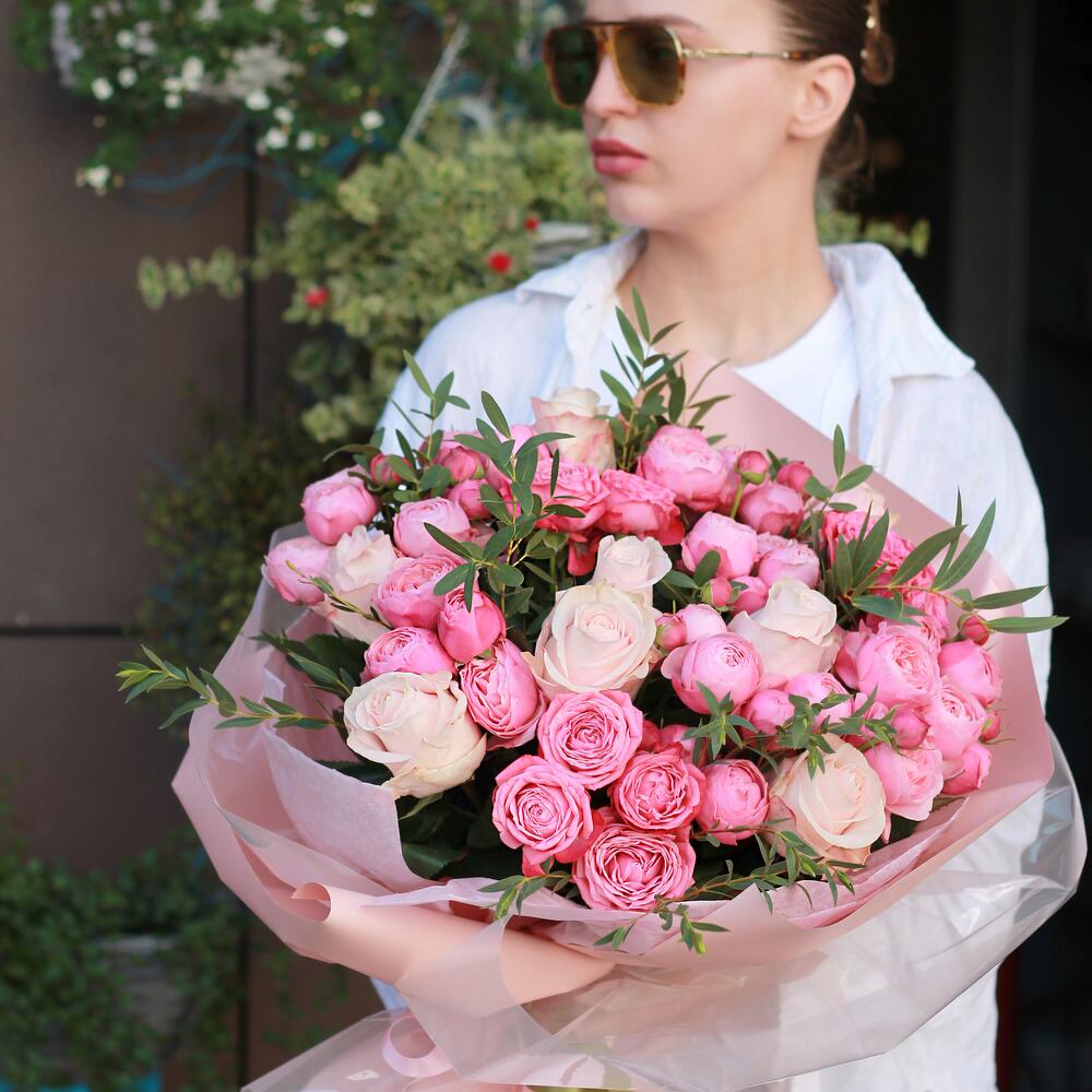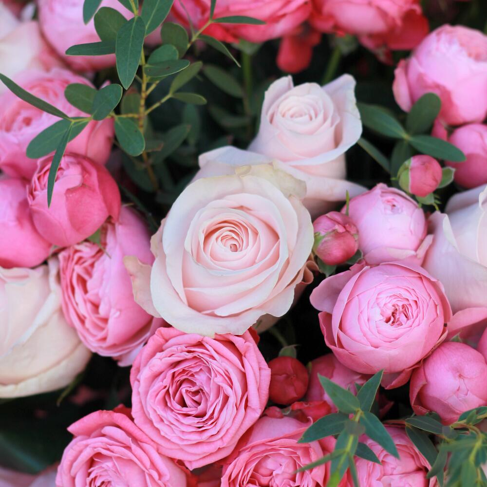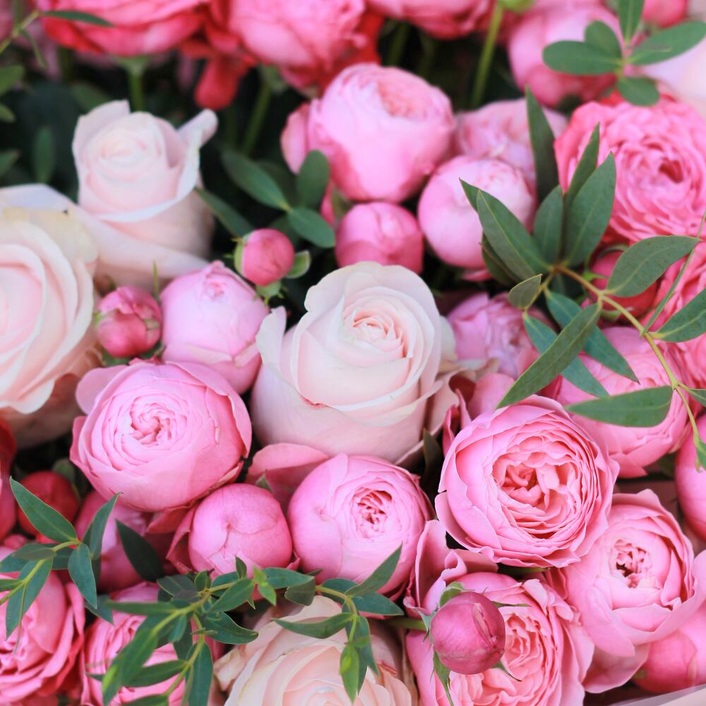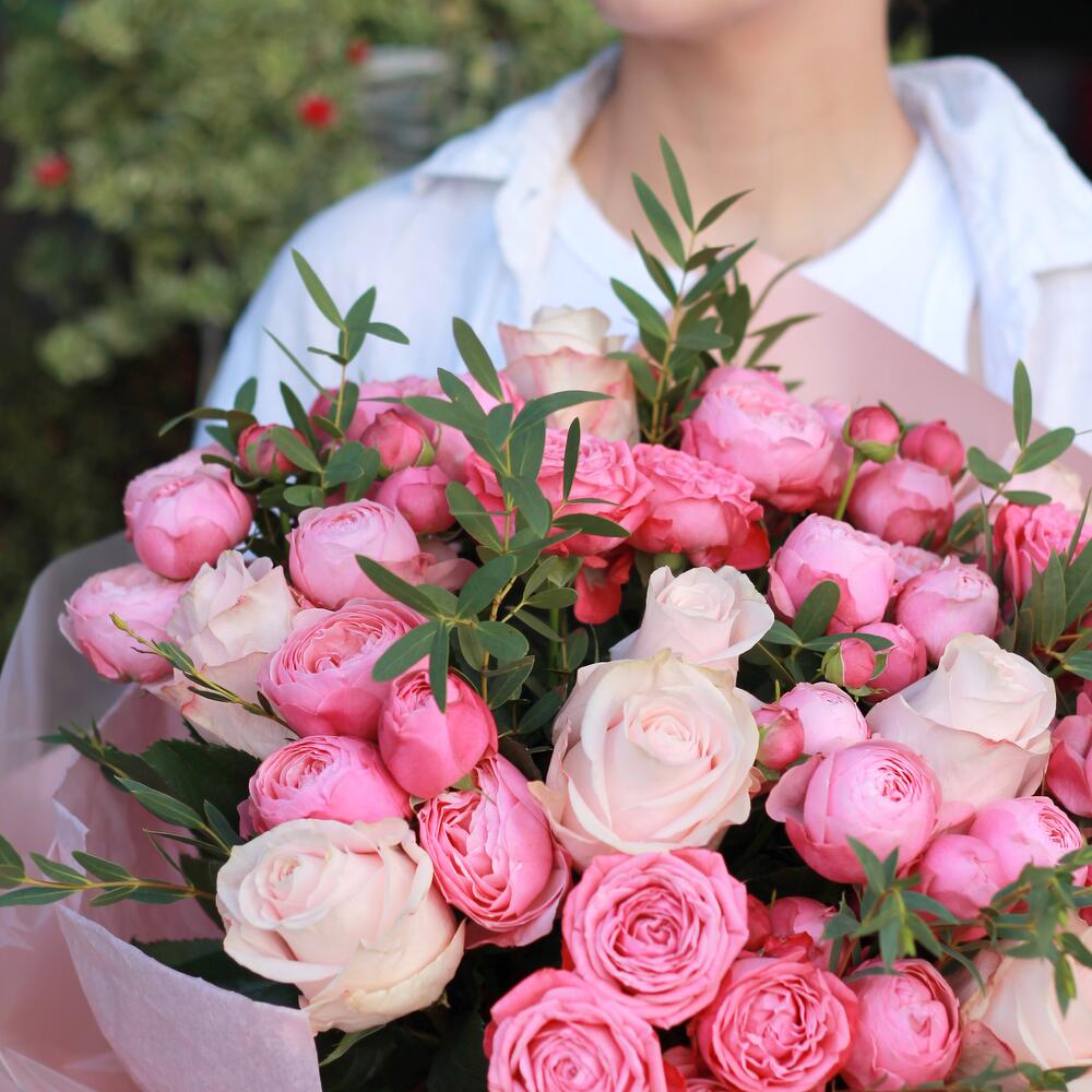 Гвоздики, Кустовые розы, Лизиантусы, Пионовидные розы, Розы
