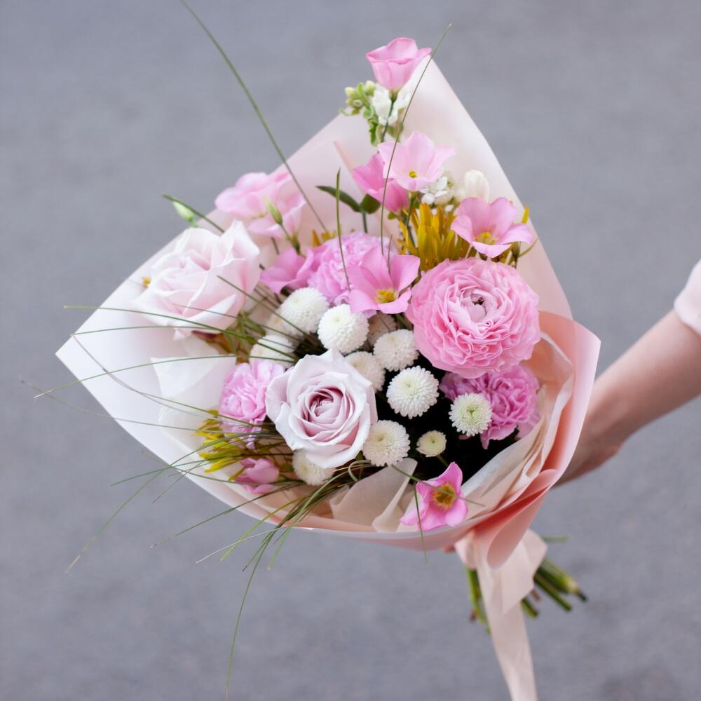 лизиантус ботаника – 1 шт.Ранункулюс – 1 шт.Роза – 2 шт.Диантус – 3 шт.Хризантема кустовая – 2 шт.Берграсс – 20 шт.каапс микс – 2 шт.Оксипеталум – 2 шт.Упаковка дизайнерская – 1 шт.