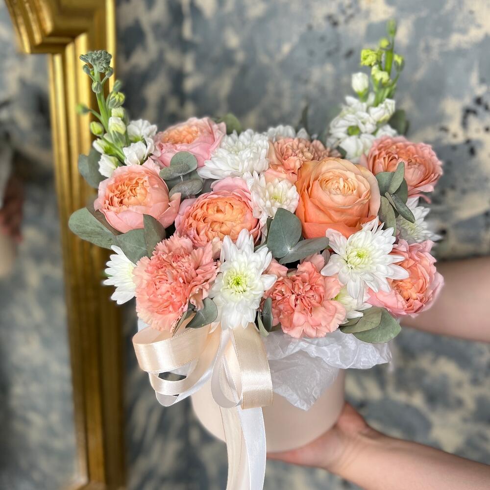 Роза кустовая пионовидная джульетта – 1 шт.Роза пионовидная кахала – 1 шт.Хризантема кустовая – 2 шт.Маттиола – 2 шт.Диантус – 3 шт.Эвкалипт – 2 шт.Лента атласная – 2 шт.Оазис флористический – 1 шт.Коробка шляпная – 1 шт.Тишью белое – 1 шт.