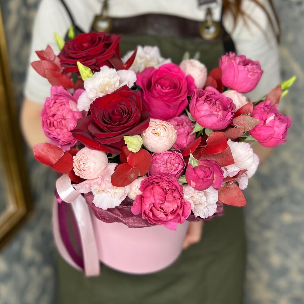 Роза Pink Floyd – 1 шт.Роза Эксплорер – 2 шт.роза пионовидная кустовая джульетта церайз – 1 шт.роза пионовидная кустовая мэнсфилд парк – 1 шт.эустома розовая – 1 шт.Эвкалипт – 2 шт.Оазис флористический – 1 шт.Коробка шляпная – 1 шт.Лента атласная – 2 шт.