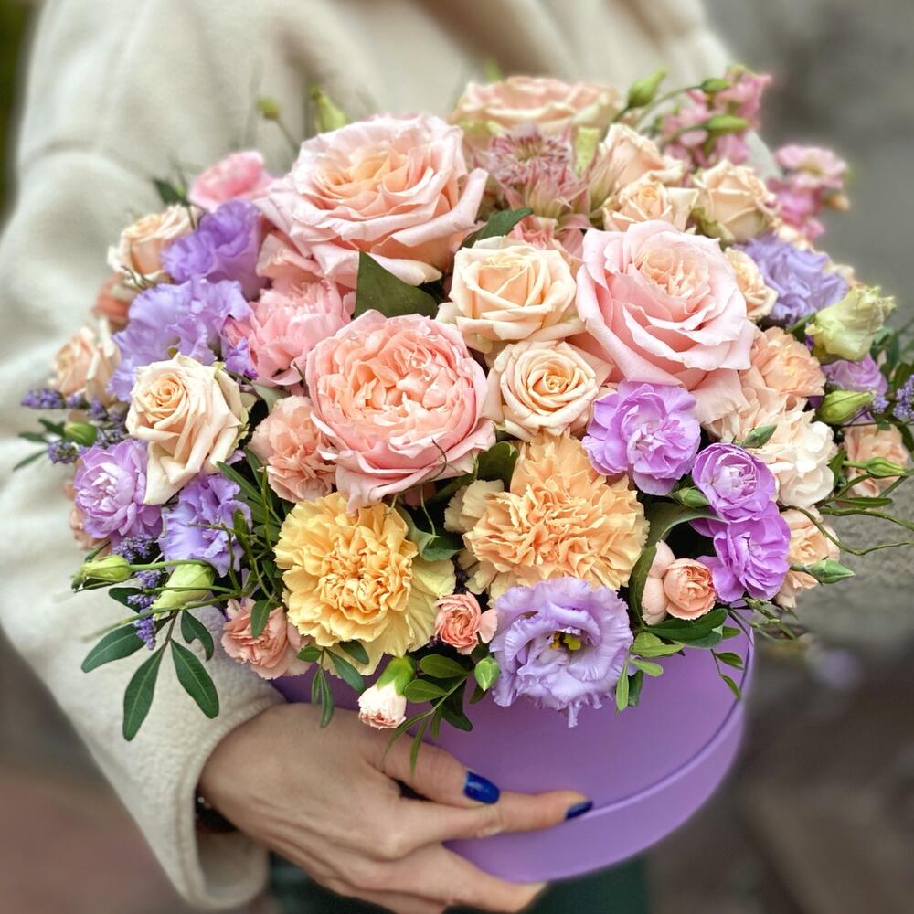 Гвоздики, Лизиантусы, Розы, Тюльпаны