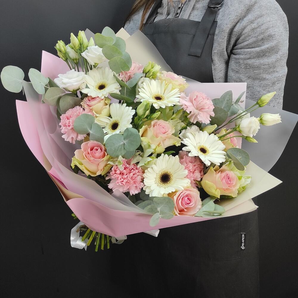 Гербера – 5 шт.Роза – 7 шт.Лизиантус – 3 шт.Диантус – 5 шт.Эвкалипт – 2 шт.Упаковка дизайнерская – 1 шт.