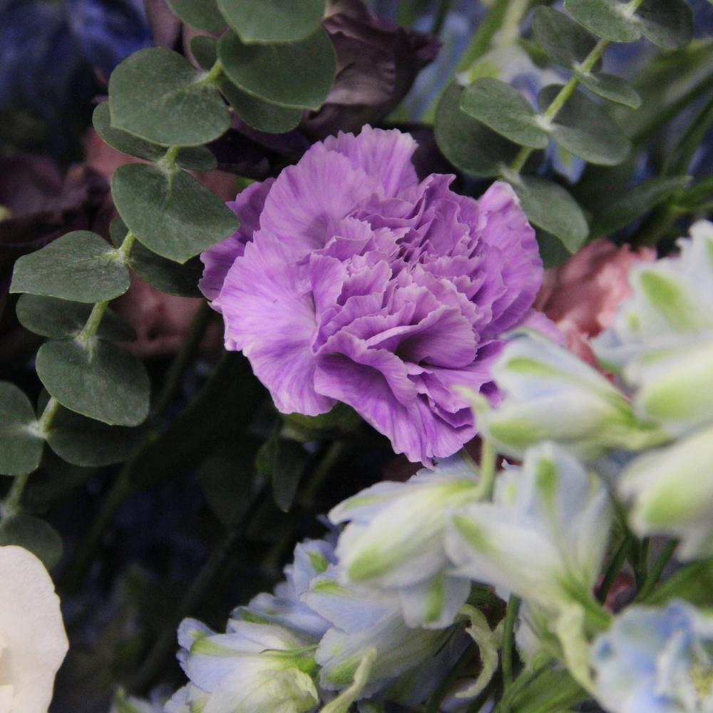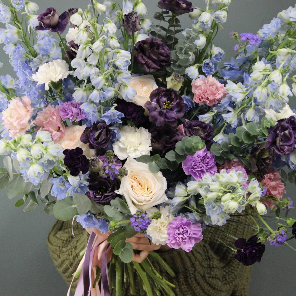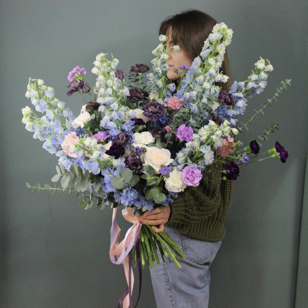 Дельфиниум – 9 шт.Лизиантус – 11 шт.Диантус – 15 шт.Роза пионовидная – 7 шт.Твидия – 5 шт.Эвкалипт – 9 шт.Фисташка – 4 шт.Лента атласная – 3 шт.