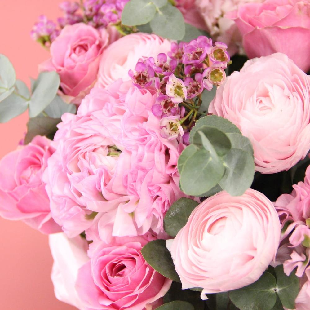 Шляпная коробка с ранункулюсами, розами, лизиантусом, ваксфлауэром, диантусом и эвкалиптом.