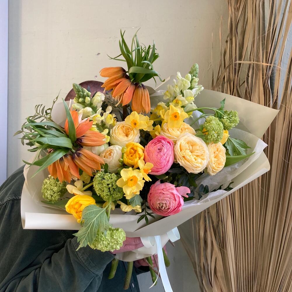 Авторский букет с рябчиками, ранункулюсами, нарциссами, калиной, кустовыми пионовидными розами и львиным зевом .