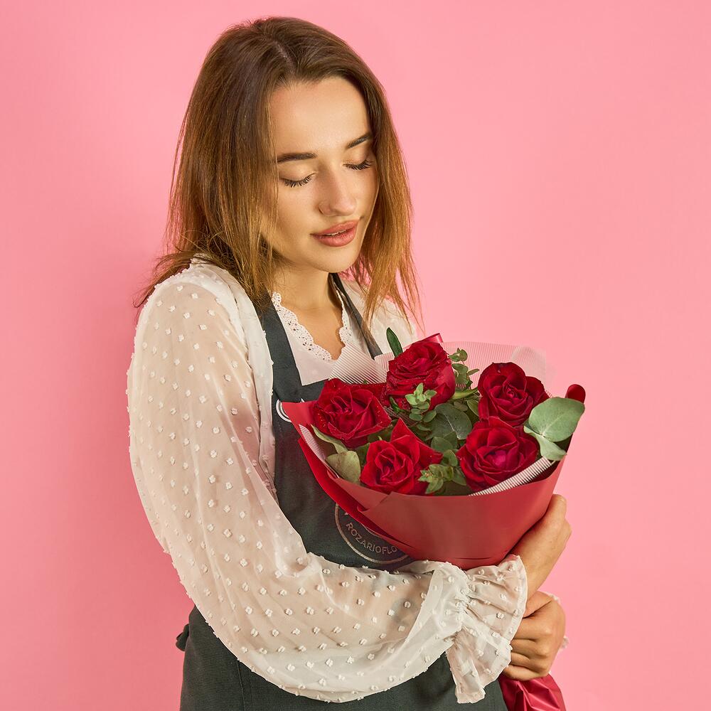 роза (красный) – 5 шт.Эвкалипт – 1 шт.пленка цветная – 1 шт.Лента атласная – 1 шт.