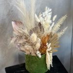 Интерьерная композиция из сухоцветов в бежево/фисташковых оттенках прекрасно дополнит любой интерьер. Пушистый ковыль добавит композиции лёгкости, а бархатная коробочка завершает уютный образ.