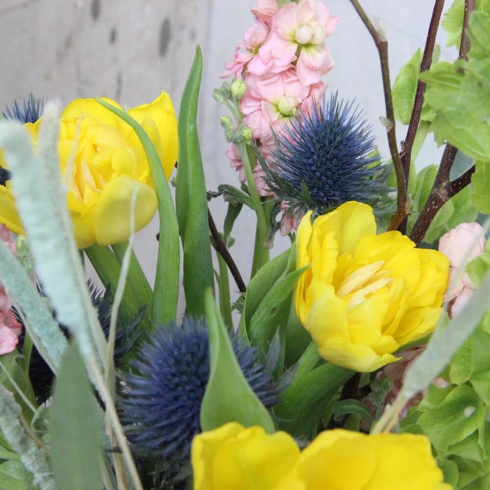Авторский, весенний букет с рябчиками, махровыми тюльпанами, дельфиниумом, эрингиумом, маттиолой и сухоцветами.