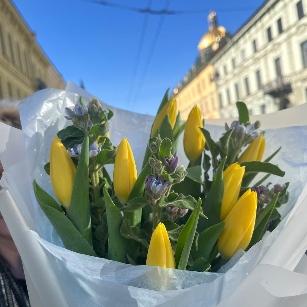 ЯРКАЯ ВЕСНА из жёлтых тюльпанов и голубой твидии